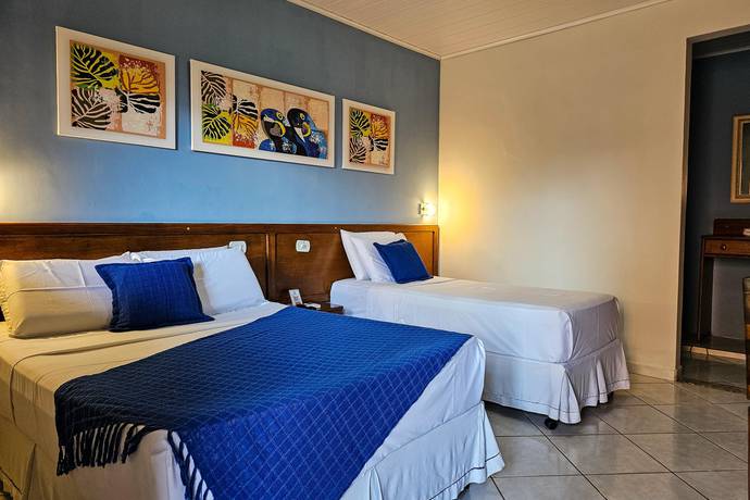 Ideal para grupos de amigos ou famílias, os quartos triplos contam com cama de casal e cama de solteiro, ou ainda três camas de solteiro. Toda rouparia é fornecida (toalhas de banho e roupa de cama) e o banheiro é privativo. Há opções de quartos térreos.